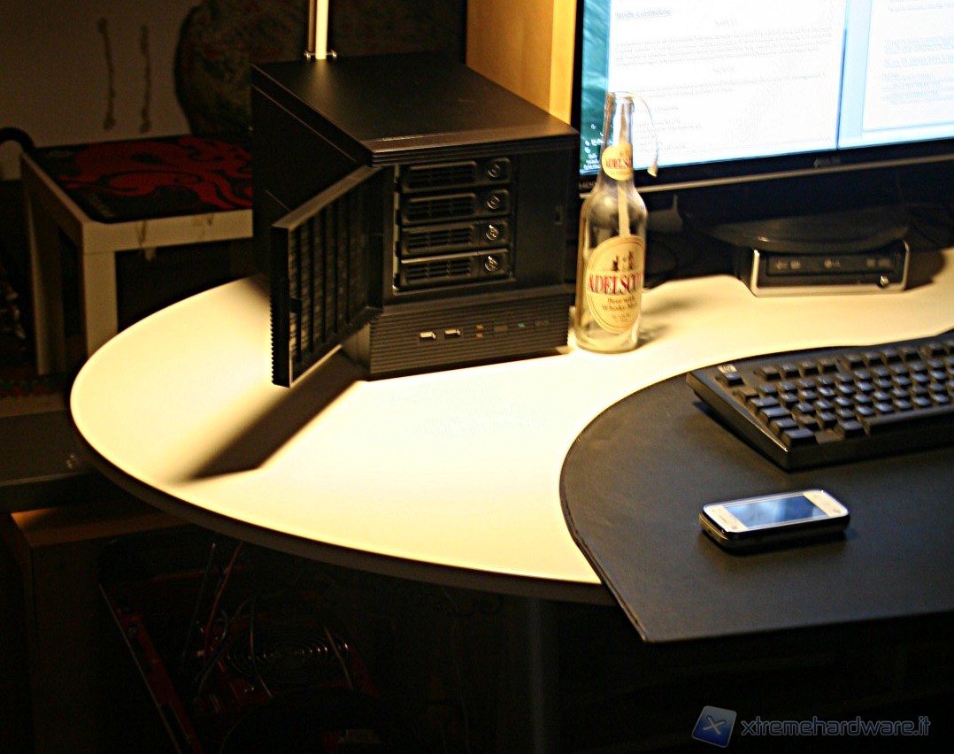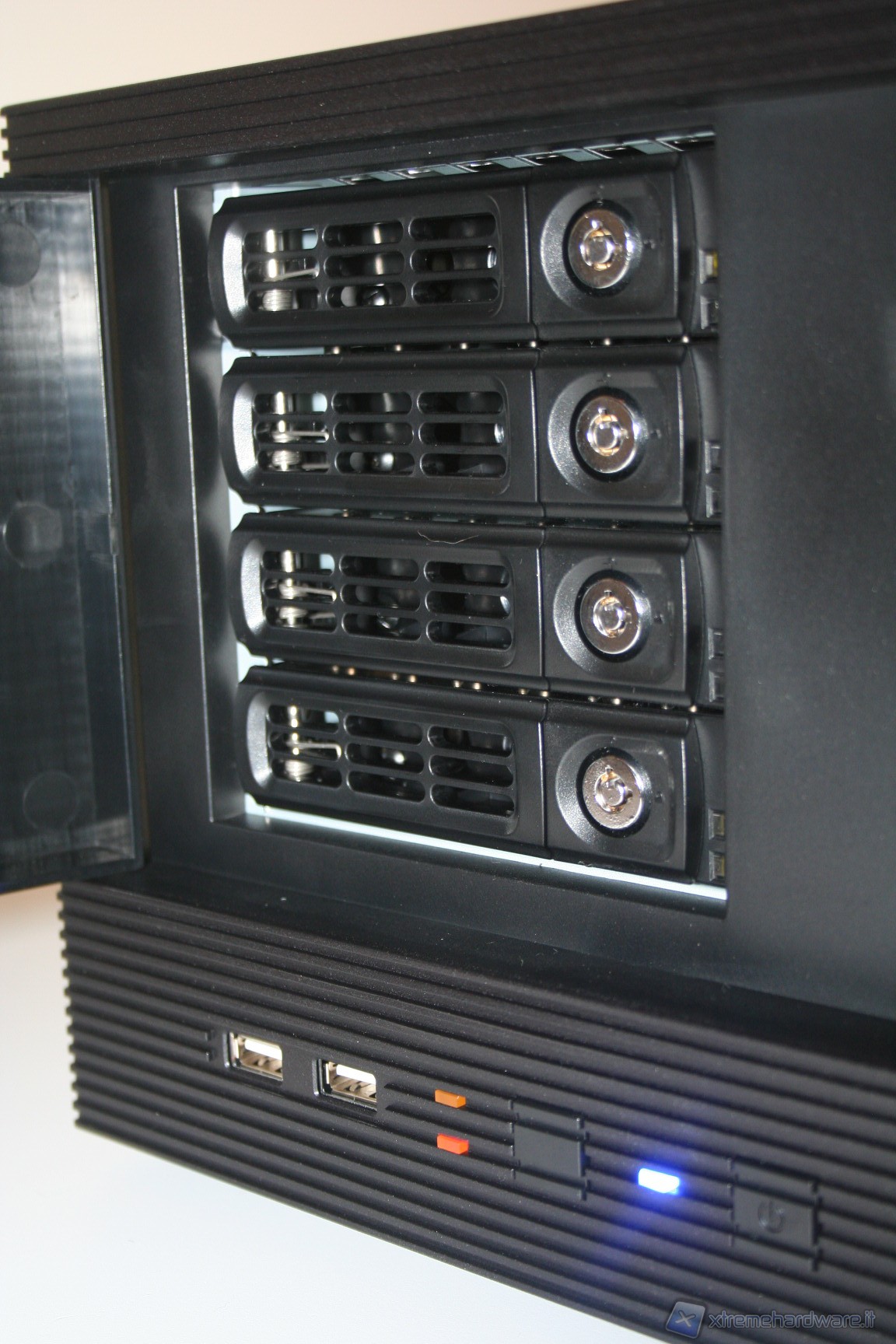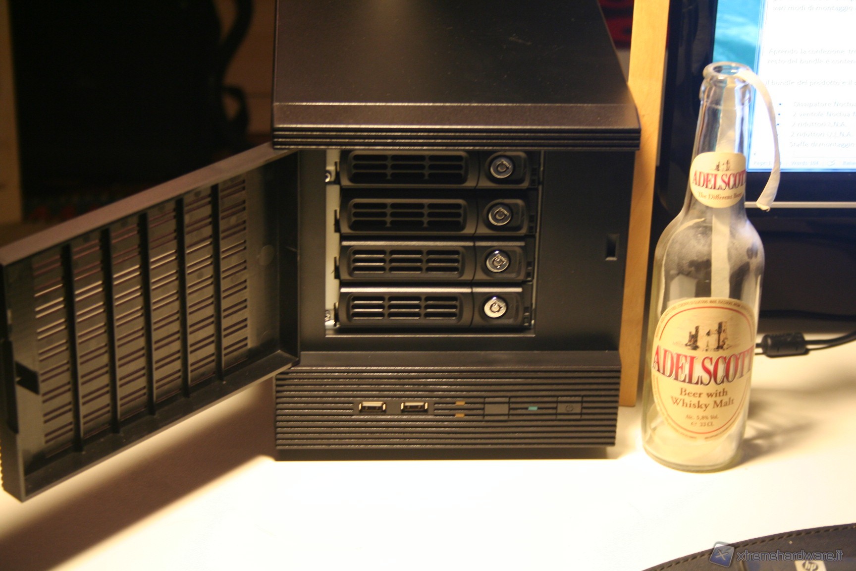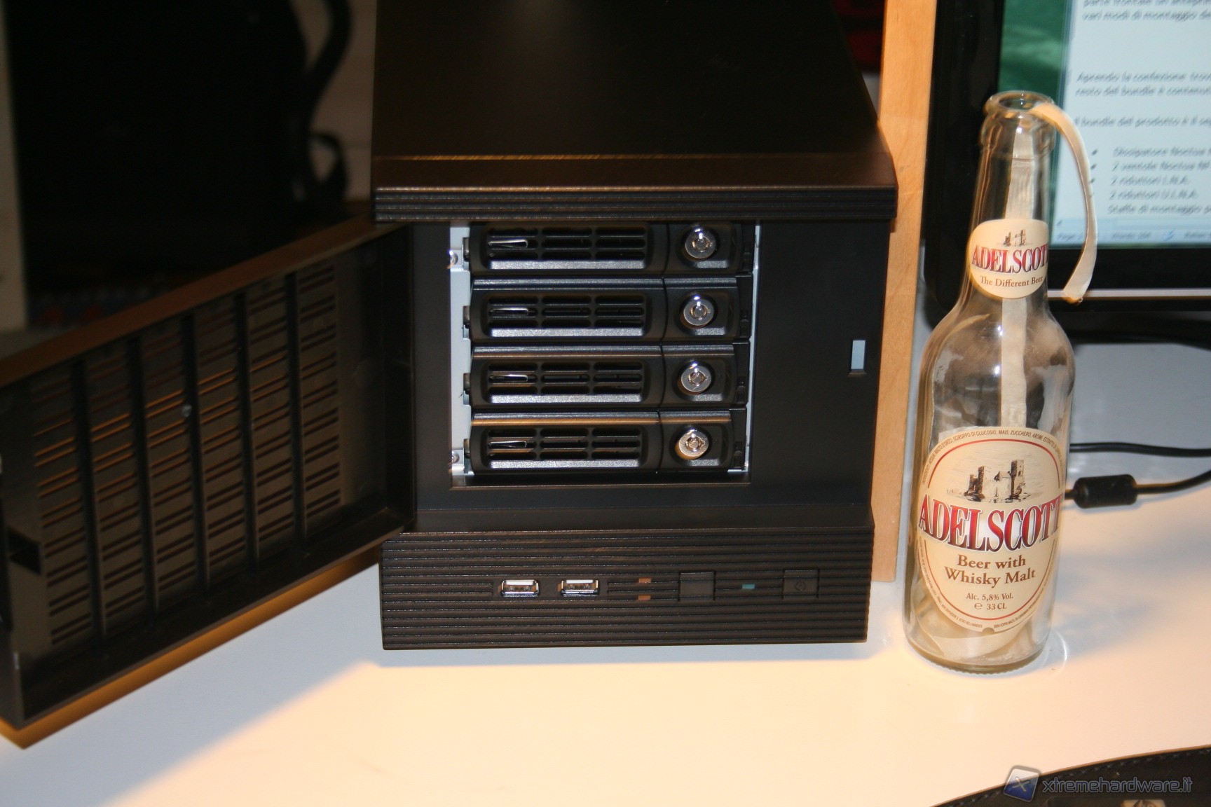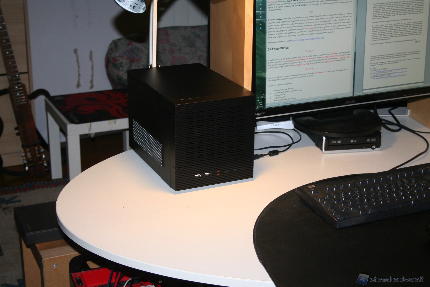 Per prima cosa dovrete smontare le due paratie laterali; fatto questo bisognerà posizionare la mascherina posteriore della scheda madre, e poi quest’ultima sulla base, per poi avvitare tramite un cacciavite con testina corta. Fatto questo sarà necessario inserire gli hard disk, avvitarli lateralmente e serrarli in posizione, processo facilissimo, sebbene però ci sia un minuscolo inconveniente ovvero che una serie di viti sono bloccate dal sistema di ritenzione in plastica laterale. Problema irrilevante, in quanto ci sono moltissimi fori di bloccaggio, ben 10 in linea teorica. Nota molto positiva : il sistema di alimentazione degli hard disk è integrato e già connesso all’alimentatore. Di una praticità impressionante, e faciliterà di molto le operazioni. Fatto questo, e montato eventualmente anche l’SSD, si potrà procedere all’installazione della scheda video (se presente) che però deve essere single slot - smontando prima i bracket di ritenzione del case, tramite l’apposito meccanismo- ; terminata questa procedura si procederà all’assemblaggio delle paratie di protezione laterali. Una procedura molto facile quindi, non dovrete preoccuparvi. Ovviamente fate attenzione a stendere il consueto velo di pasta termica tra la CPU, sempre se la soluzione non è integrata, e la base del dissipatore, oltre a connettere tutti i vari cavi di alimentazione dedicati, compresi quelli degli hard disk. Riportiamo alcune fotografie a lavoro terminato :