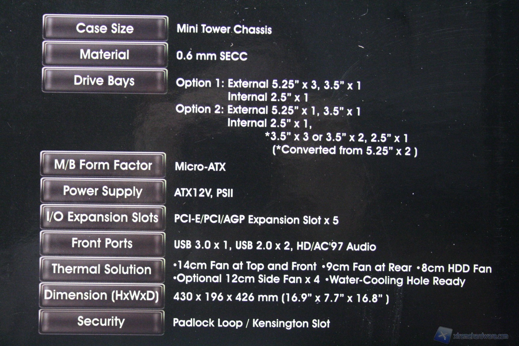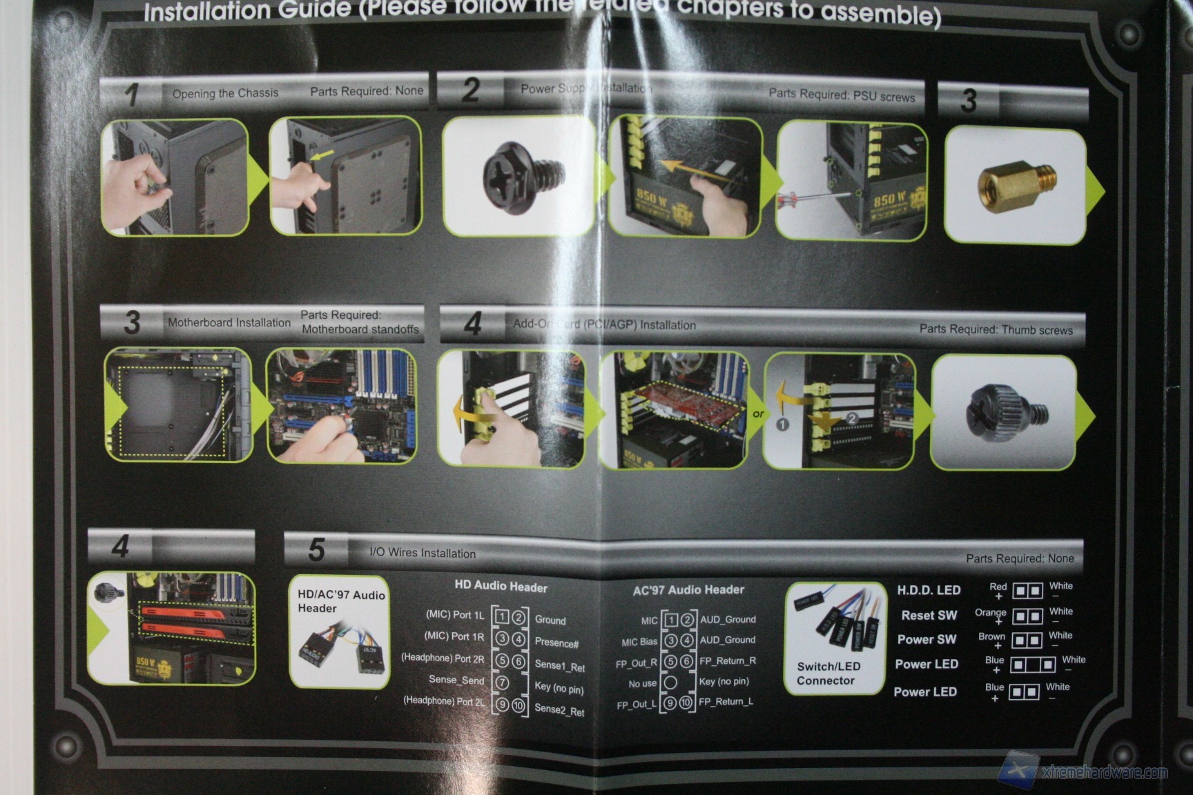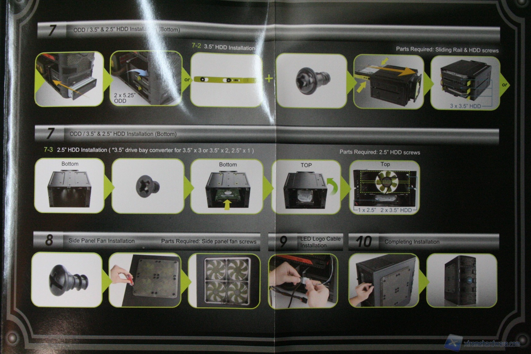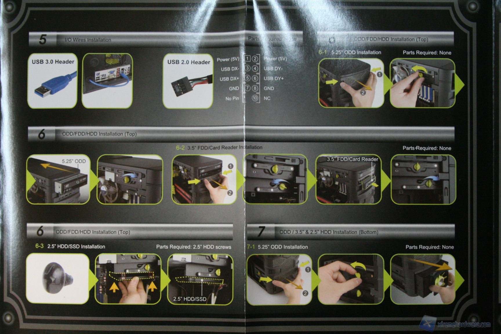 Il bundle in dotazione è particolare in quanto non ci sono le fascette fermacavo, che sono sostituite però da quattro supporti con adesivo alla base che permettono un buon cable routing. Come ventole ne troviamo 2 140mm (una sul top e una frontale), una 90mm (posteriore) e una 80mm di fronte agli HDD,[L1] una dotazione quindi di ottimo livello per un cabinet low-budget !