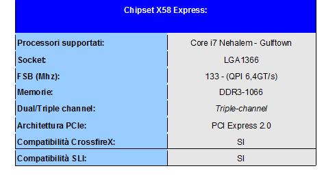 Allo stato attuale il chipset che supporta la nuova cpu Gulftown con un semplice aggiornamento del bios è l' X58 Express di Intel. Questo chipset fa parte del segmento Enthusiast. E' indirizzato pertanto a tutto gli utenti che vogliono il massimo dal proprio sistema.