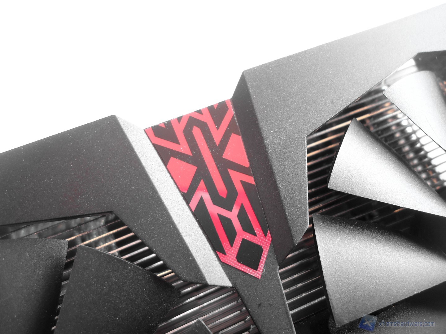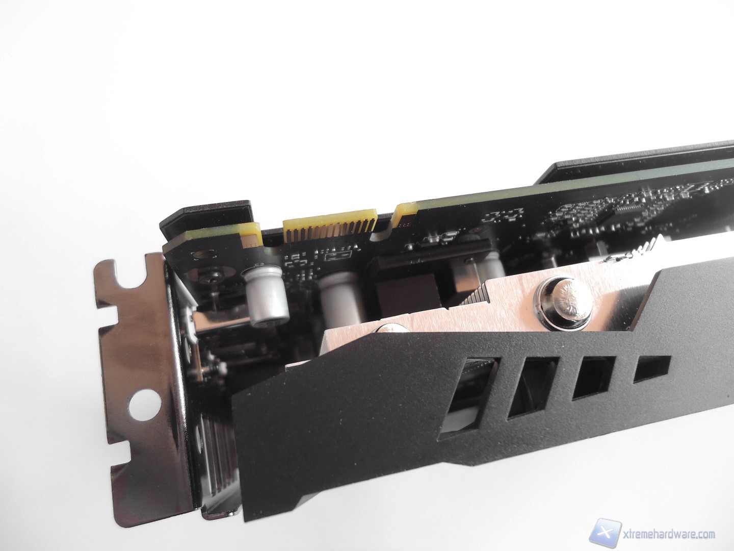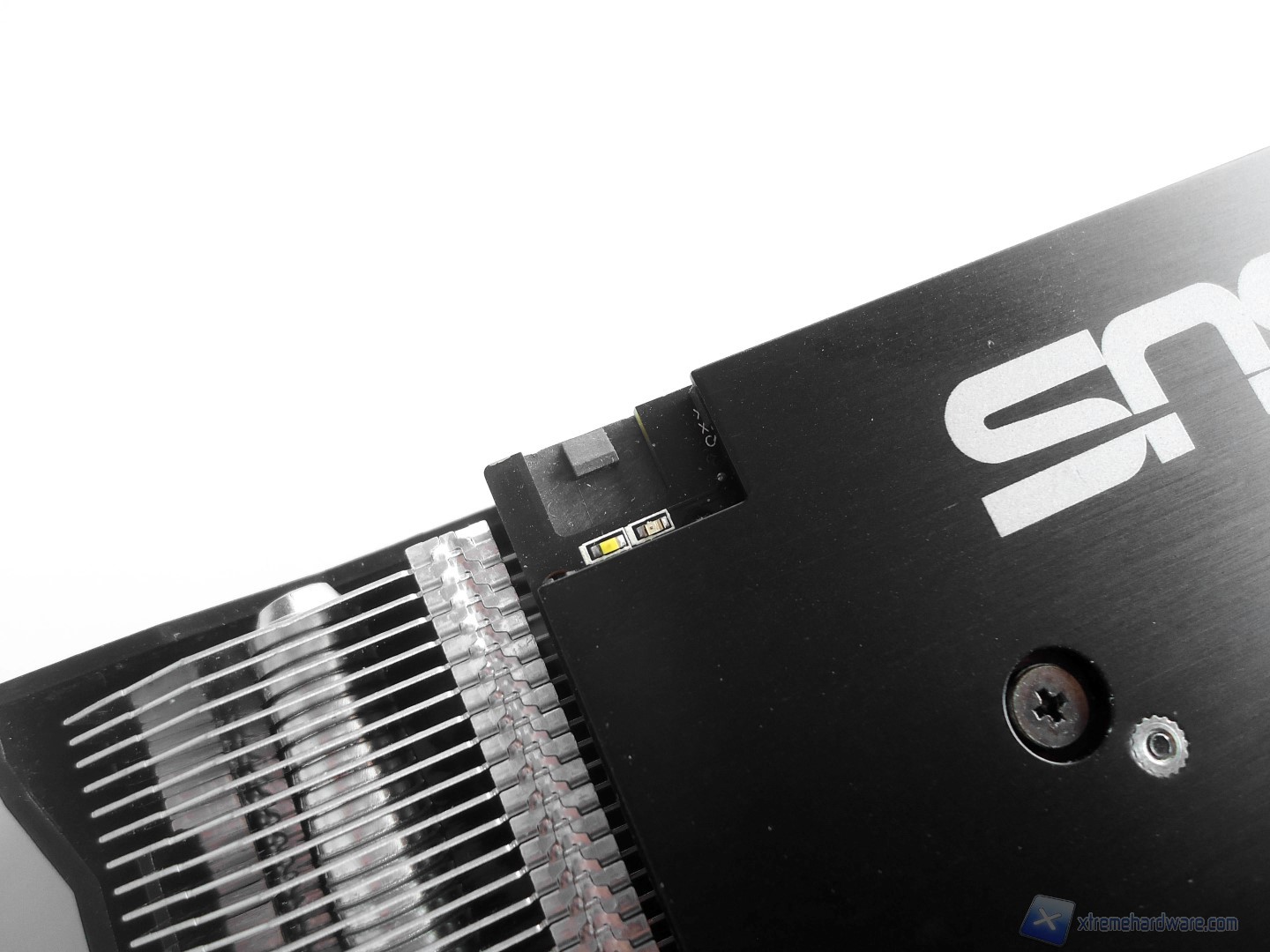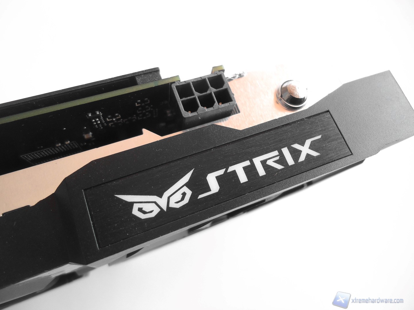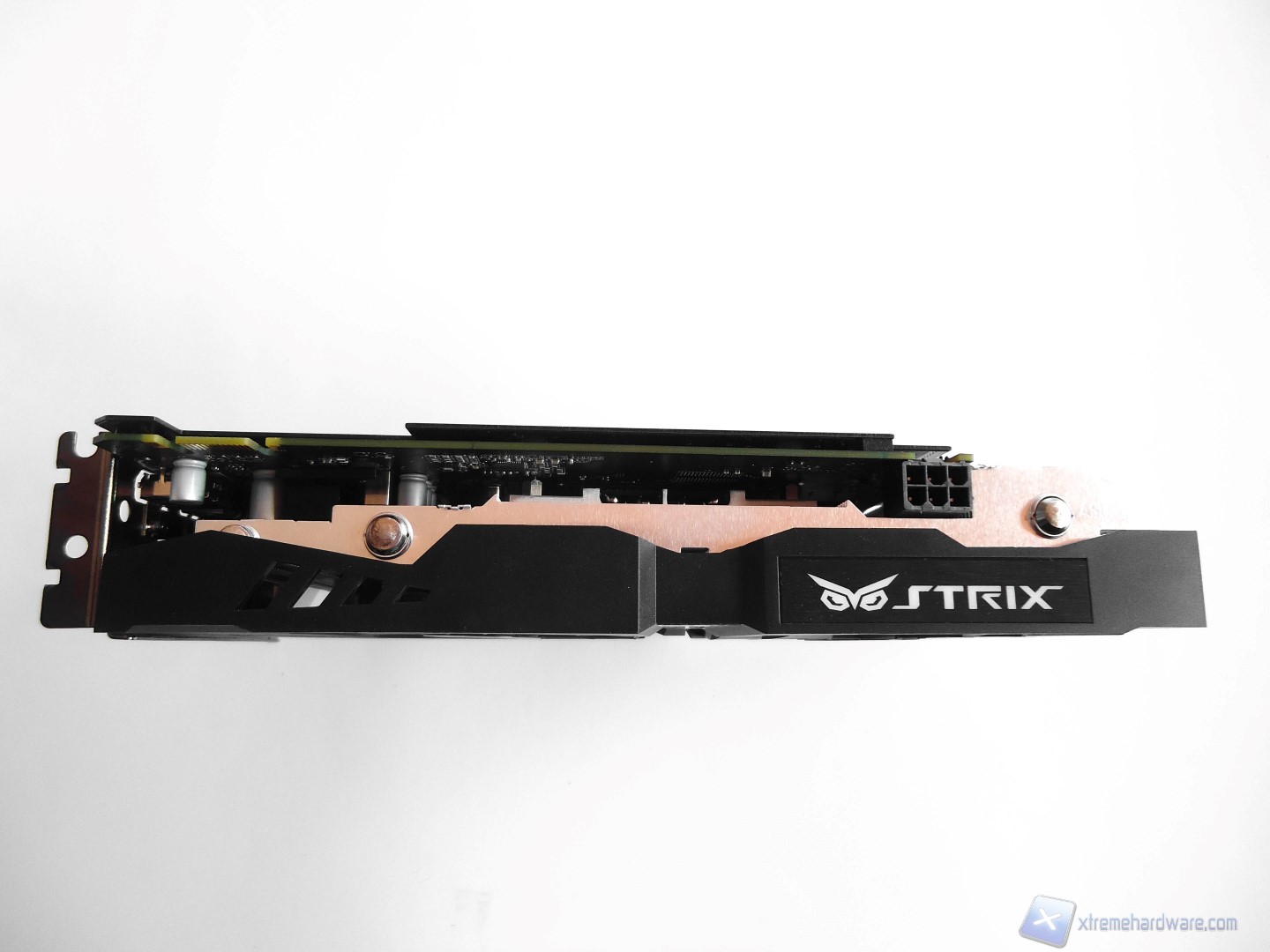 La parte superiore della scheda presenta prima di tutto il logo Strix, che purtroppo non è dotato di nessun LED, quindi non si illuminerà quando la scheda sarà in funzione. Sul radiatore in alluminio possiamo notare prima di tutto le terminazioni di 3 delle 4 heatpipes di cui è dotato questo dissipatore, inoltre sul PCB abbiamo l’unico connettore di alimentazione da 6-pin e il connettore SLI.