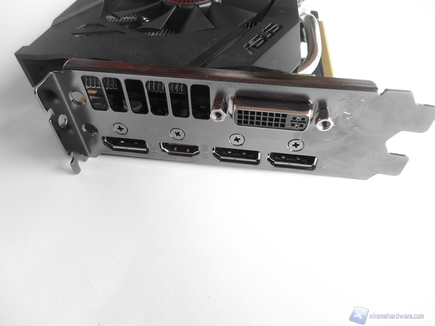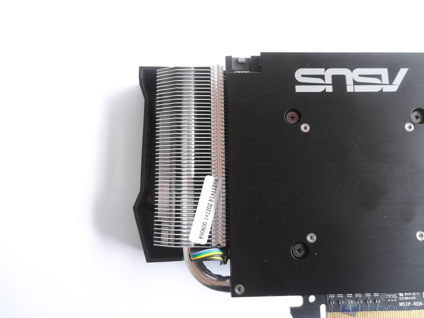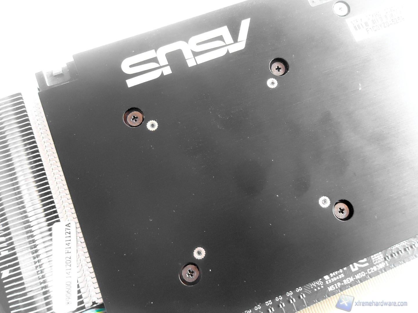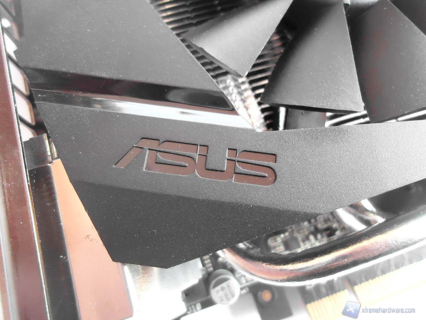 Prendendo in mano la scheda, notiamo che, nonostante le dimensioni compatte, non è molto leggera, infatti pesa circa 650 grammi. Questo è dovuto alla presenza di un dissipatore molto pesante e un backplate in alluminio che copre interamente la parte posteriore del PCB. La cover è realizzata in plastica, ma data la sua qualità non ci fa rimpiangere una cover in metallo. La cover in questo caso ha il compito di sorreggere le ventole, in quanto non sono avvitate direttamente sul dissipatore in alluminio sottostante. Le 2 ventole che raffreddano il radiatore sono molto piccole, infatti misurano solamente 75 mm di diametro ciascuna. Queste ventole sono caratterizzata da un design flat che le consentono di avere una maggiore pressione statica rispetto alle ventole standard. Oltre a questo particolare design delle ventole, Asus ha dotato queste ventole di un particolare controller che le spegne quando la scheda non è sottoposta a un carico di lavoro molto elevato e non supera una determinata temperatura. Il radiatore in alluminio presenta 4 heatpipes in rame nichelate che sono a diretto contatto con la GPU, caratteristica principale del dissipatore DirectCU II. Le heatpipes sono di dimensione differenti ed infatti abbiamo le heatpipes più esterne che sono da 8mm di diametro mentre le due centrali sono da ben 10mm. Per quanto riguarda la dissipazione della sezione VRM, che è composta da 4+1 fasi, è stato predisposto un piccolo dissipatore in alluminio passivo di colore nero. Il controller è di tipo PWM, si tratta del uP1608TK, mentre notiamo la componentistica Super Alloy Power, come le induttanze. Come possiamo vedere dalla foto del PCB, abbiamo la sezione di alimentazione posta alla sinistra del chip di silicio mentre nella parte destra troviamo i chip RAM, i connettori  di alimentazione delle ventole e della scheda video. Possiamo notare, inoltre, che nella parte anteriore del PCB sono presenti solamente 2 dei 4 chip Samsung di cui è dotata questa scheda in quanto i restanti sono posizionati nella parte posteriore del PCB. I chip RAM marchiati Samsung riportano la sigla K4G41325FC-HC28.