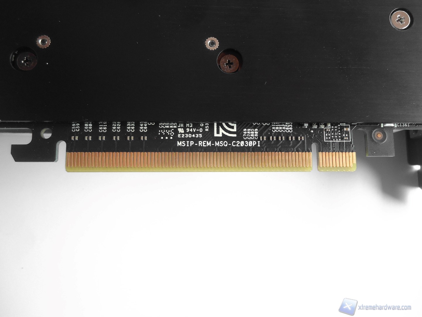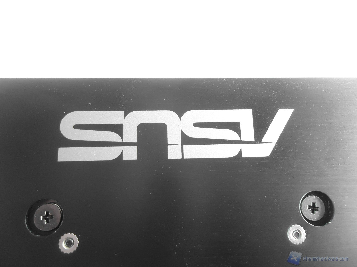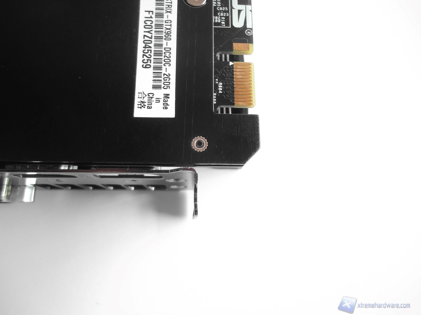 Girando la scheda e mettendo in mostra il posteriore della VGA, notiamo con piacere la presenza di un bellissimo backplate in alluminio spazzolato di colore nero, abbellito dalla presenza del logo Asus in bianco. Questo backplate, oltre ad avere una funzione estetica, svolge anche un ottimo lavoro dal punto di vista della dissipazione dei componenti installati sulla parte posteriore del PCB, oltre a dare maggiore rigidità alla scheda stessa. Da notare l’assenza di un bollino di garanzia sulle viti posteriori del dissipatore, anche se non abbiamo la certezza che sarà cosi anche per le schede vendute al pubblico. In caso di assenza del bollino possiamo cambiare pasta termica, cambiare dissipatore o installare un waterblock senza perdere la garanzia. Nella parte posteriore del PCB sono posizionati due chip RAM Samsung che sono dissipati proprio dal backplate in alluminio. Da questa inquadratura possiamo vedere meglio l’unico connettore per lo SLI, il connettore PCI-E 3.0 e il connettore di alimentazione girato al contrario rispetto allo standard in modo da poter inserire il pin di alimentazione che altrimenti andrebbe a sbattere contro il dissipatore. Inoltre il connettore di alimentazione è dotato di due LED distinti da una diversa colorazione, bianca quando la scheda è alimentata correttamente e rossa quando non lo è. Infine notiamo che la cover è molto più lunga del PCB e che il PCB della scheda video è più alto rispetto allo standard.