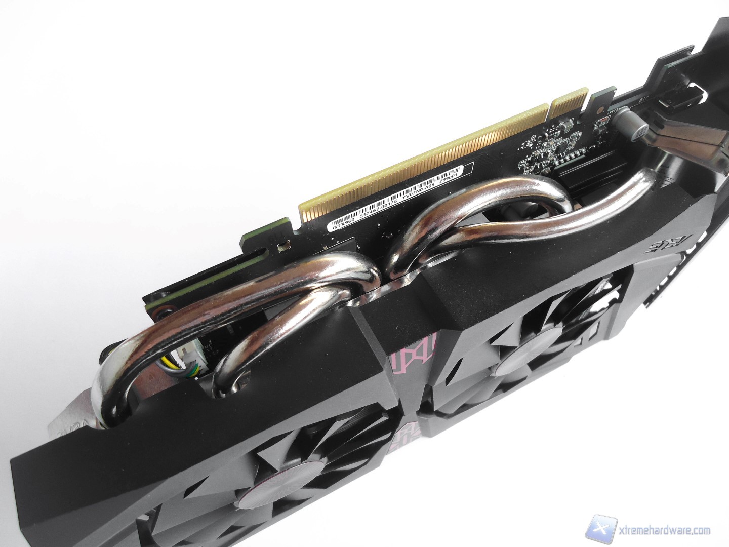 La parte inferiore della scheda ci mette in mostra le bellissime curve compiute dalle 4 heatpipes in rame nichelate di cui dispone questo prodotto oltre al dissipatore in alluminio di colore nero dedicato alla dissipazione delle fasi di alimentazione.