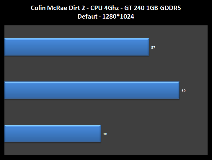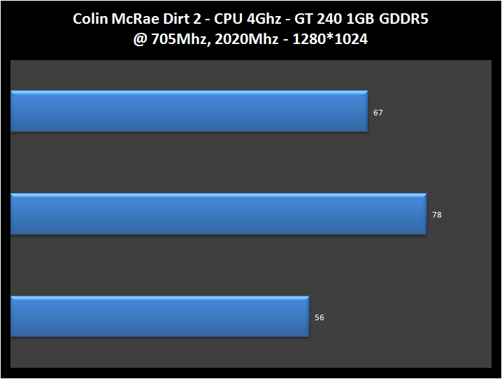Considerazioni giochi: la scheda con questo nuovo titolo si è dimostrata abbastanza competitiva, infatti anche a default a 1280*1024 riesce comunque a girare ad una media di 57 fps, mentre in overclock passa ai 67 senza problemi e ciò ci permette di goderci il titolo con i dettagli settati su Alti tranquillamente, ad accezione dei filtro AA e Anisotropico che sono stati disattivati.